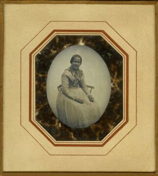 Mit leicht geöffnetem Mund, als würde sie gerade etwas sagen, schaut sie direkt in die Kamera. Auf der Daguerreotypie ist das Alter der Magd schwer zu schätzen. Bei dem gestreiften Kleid handelt es sich sicherlich um die Sonntagsgarderobe der einfachen Frau.