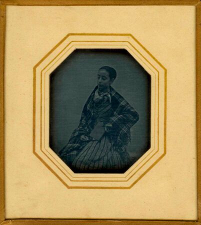 Diese Aufnahme entstand vor dem Haus der Villa Debus. Es ist wohl Winter, denn Emilie Debus hat sich über ihre Schultern eine dicke Decke gelegt, unter der gestreiftes Kleid hervorschaut. Sie schaut mit leicht geneigtem Kopf nach links. Ihr linker Ellenbogen ist abgewinkelt und in ihrer linken Hand hält sie ein Buch – ein Zeichen für ihre Bildung und Neugierde – während die rechte Hand entspannt im Schoß liegt. Um Ihren Hals hat sie ein Tuch gebunden; die Spitzen hängen keck nach unten.