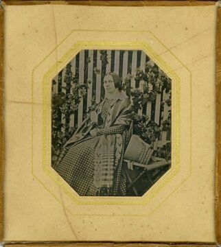 Auf dem Bild sitzt Fredereke Debus, Johann Wilhelms älteste Tochter auf einem Stuhl in der Gartenlaube. Der Körper ist nach links gedreht , sie hat den linken Arm lässig über die Stuhllehne gehängt, die andere Hand liegt im Schoß. Am linken Mittelfinger trägt sie einen auffälligen Ring. Sie trägt ein kariertes Kleid mit Spitzenkragen, einen langen, gemusterten Schal und schaut mit einem verschmitzten Lächeln in die Kamera. Dass ihre Kleidung sich von dem längsgestreiften Hintergrund durch Karos absetzt, scheint ein Stilmittel von Debus zu sein. Rechts neben ihr steht ein Klapphocker mit gestreifter Sitzfläche, auf dem ein Kiepenhut mit Schleife liegt. Einen solchen hält sie auch auf dem Gemälde von Karl Engel gen. von der Rabenau in der Hand. Die Blüten der Büsche ranken sich durch die Laube, so dass das Bild im Sommer entstanden sein muss. Vermutlich entstand das Bild zu ähnlicher zeit, wie die Daguerreotypie mit Babette Debus.Frederike Debus (1828 – 1862) war mit Ferdinand Bender verheiratet und gemeinsam hatten sie eine Tochter. Seit 1841 war Bender Hofprediger in Darmstadt und ab 1879 Oberhofprediger. 1858 Mitbegründer des Diakonissenhauses Elisabethenstift und ab 1873 dessen Vorsteher. Ferdinand Bender weigerte sich 1884 den Großherzog Ludwig IV. mit Alexandrine Gräfin Kolemine in morganatischer Ehe zu trauen. Frederike starb früh mit nur 34 Jahren.