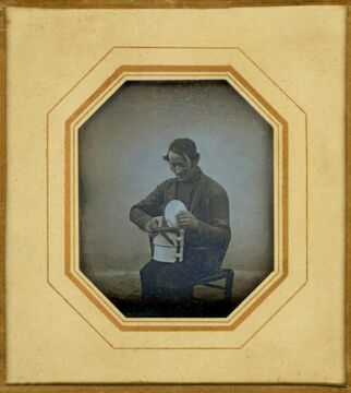 Die Aufnahme zeigt laut der beschriftung den Gärtner der Villa Debus. Da Johann Wilhelm Debus in Schönberg einen weitläufigen Park mit Brunnen, Weinbergen und Gärten besaß ist klar, dass es sich bei dem Gärtner nicht um eine einfache Hilfskraft gehandelt haben kann. Wahrscheinlich zeigt die Darstellung den Erbach-Schönbergisch gräflichen Hofgärtner Carl Gottlieb F. Storck. Debus entscheidet sich für eine ganz außergewöhnliche Darstellung des Gärtners: Storck sitzt auf einem Stuhl, der jedoch nicht frontal ausgerichtet ist, vor der Villa in Schönberg. Er trägt ein gepunktetes oder kleinkariertes Jackett, ein dunkles Halstuch und eine schwarze Hose. Es scheint ein dezentes Outfit zu sein, das ihn auch als „Arbeiter“ darstellt. Auf seinen Knien hält er einen Henkelmann, dessen Deckel er mit seiner linken Hand anhebt. Er schaut hinein und lächelt, als ob er sich freut, dass es heute etwas besonders gutes zum Mittagessen gibt. Debus scheut sich nicht, auch seine bediensteten zu fotografieren. Ebenso wie die Magd, wird auch der Gärtner Daguerreotypiert, was aber auch zeigt, dass er ein freundschaftlich-persönliches Verhältnis zu diesen Personen hat.