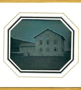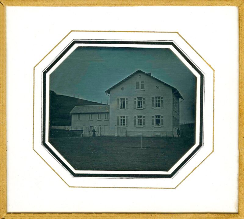 Diese Aufnahme aus dem Frühling des Jahres 1843 zeigt die Ansicht der Villa Debus in Schönberg von Westen her. Debus besaß dieses Landhaus wenigstens seit den 1840er Jahren und lebte dort zeitweise bis mindestens 1855. Wahrscheinlich fiel seine Wahl für den Wohnort Schönberg aufgrund der Tatsache, dass die Schwester seiner Mutter, Friedericke Daum, Beschließerin auf Schloss Schönberg war. In der frühen Zeit war es ungewöhnlich, Architektur zu daguerreotypieren. Auch Debus konnte das Haus nicht einfach für sich stehen lassen: Vor dem Haus und auch in den Fenstern positioniert er Menschen und schafft eine lebendige Staffage.