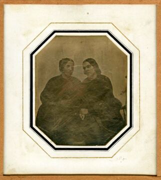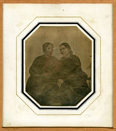 Die Daguerreotypie liefert aufgrund der fehlenden Beschriftung keine Hinweise auf das Entstehungsdatum oder wer die dargestellten Personen sein können. Durch den vergleich zu anderen Abbildungen, ergeben sich jedoch Rückschlüsse: Das Passepartout ist das gleiche wie das der Daguerreotypie von Friederike Daum, Debus’Tante, aus dem Jahr 1843. In einem Ähnlichen Zeitraum wurde wohl auch diese Arbeit erstellt. Leider ist die Platte beim Versuch, das Silber zu polieren zerkratzt. Aber man erkennt noch deutlich, dass die rechte abgebildete Person Ernestine ist, von der es auch eine Einzelaufnahme gibt und vermutet wird, es könnte sich um Debus‘ ältere Schwester handeln. Die Dame auf der linken Seite konnte bislang nicht identifiziert werden. Vielleicht ist es die älteste Schwester Charlotte Elisabeth Johanna Wilhelmine. Hier muss geforscht werden. Außer, dass beide dunkle Kleidung tragen, ist aufgrund der nicht optimalen Belichtung nichts an Details zu erkennen.