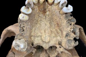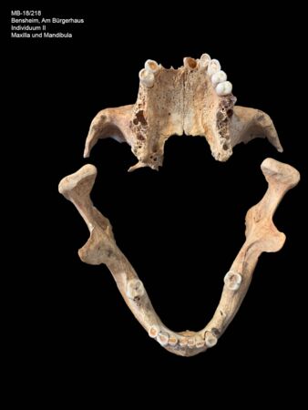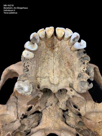 Im Bereich des knöchernen Gaumens lassen sich entzündliche Veränderungen feststellten, außerdem sind 12 von 15 vorliegenden Zähnen von Karies befallen. Neben den Kariesläsionen lassen sich noch intravitaler Zahnausfall, Parodontitis und eine Abszesshöhe an der Stelle 11 und 12 erkennen.