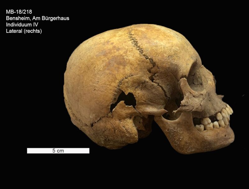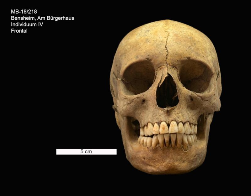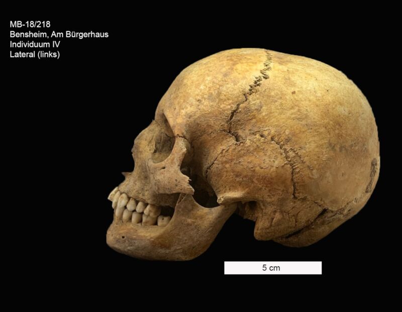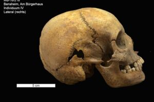 Das Individuum IV verzeichnet einige pathologische Veränderungen im Kieferbereich. Am knöchernen Gaumen lassen sich Entzündungserscheinungen feststellen, zudem Kariesläsionen an der Stelle 11. Außerdem lassen sich massive Zahnsteinanlagerungen an den Stellen 42, 41, 32 und 31. Neben diesen Erkrankungen lassen sich auch Mangelerscheinungen in den Orbita-Dächern feststellen, welche als Cribra orbitalia angesprochen werden können.