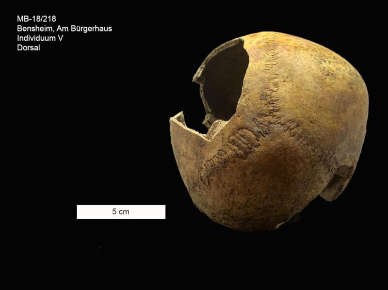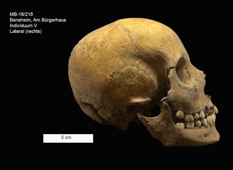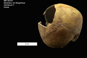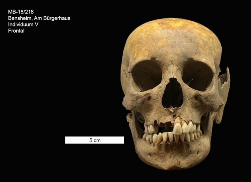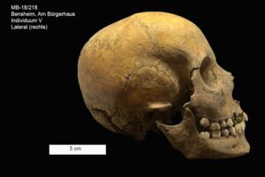 Das Individuum V lässt sich in die Altersklasse Juvenil einordnen und zeigt im pathologischen Befund kleine Erkrankungserscheinungen im Gaumenbereich und in den Augenhöhlen.