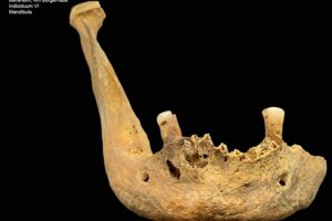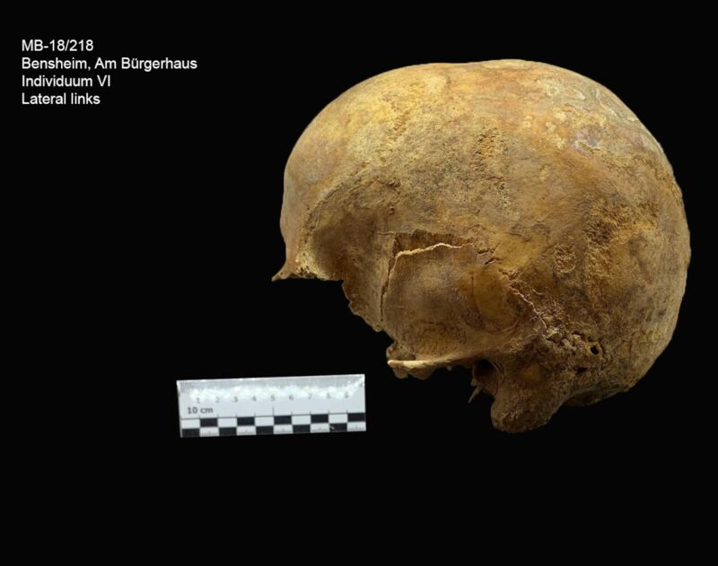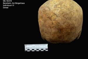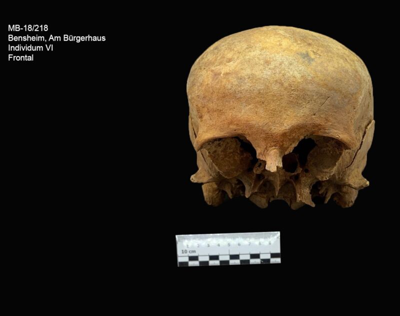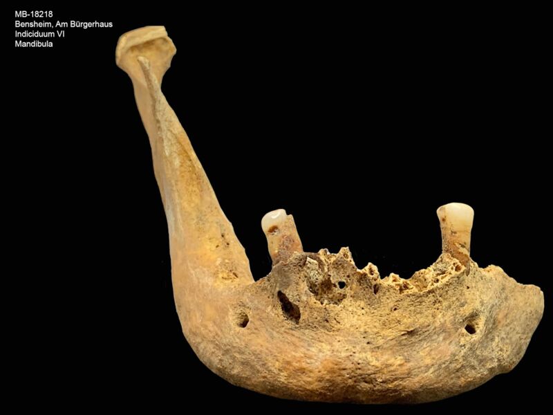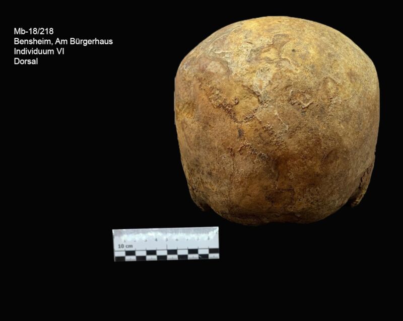 An dem Hirnschädel lassen sich im Bereich der Parietalia und des Occipitale leichte, entzündliche Auflagerungen erkennen. Außerdem befinden sich am Unterkiefer zwei Abszesshöhlen (Position 42 und 43). Zahn 43 weist zudem Kariesbefall auf. Die Zähne 48, 47, 46, 45, 44, 43 und 36 sind intravital ausgefallen.