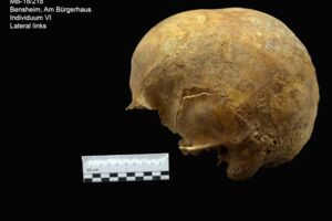 Die morphologische Geschlechtsbestimmung basiert bei diesem Individuum nur auf den Ausprägungen der anatomischen Regionen des Hirnschädels. Der Schädel zeichnet sich durch ein spürbares hohes Gewicht aus und wirkt generell sehr robust. Die Muskelansatzstellen am Processus mastoideus und des Hinterhauptes sind stark ausgeprägt. Ebenso die Einziehung der Glabella und der Augenbraunhöcker. Diese Merkmale würden für ein männliches Individuum sprechen. Die sehr steile Stirn hingegen spricht für ein eher weibliches Merkmal. Das Individuum VI kann mit tendenziell männlich angesprochen werden.
